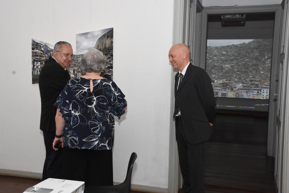 A profa. Margarida acompanha a visita do Reitor Pe. Josafá S.J. e do prof. Karl Erik à sala "Expansão e resistência" da exposição "Gávea - Território de Diversidades, Morada de Contradições".