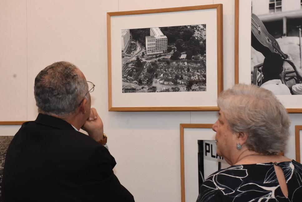 O Reitor Pe. Josafá S.J. e a profa. Margarida observam as fotografias do Parque Proletário da Gávea expostas na sala "Expansão e resistência" da exposição "Gávea - Território de Diversidades, Morada de Contradições".