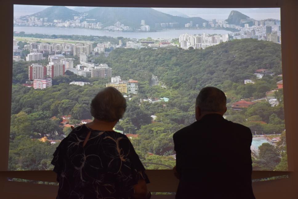 A profa. Margarida e o Reitor Pe. Josafá S.J. observam as projeções da sala "Memória e contrastes" da exposição "Gávea - Território de Diversidades, Morada de Contradições".