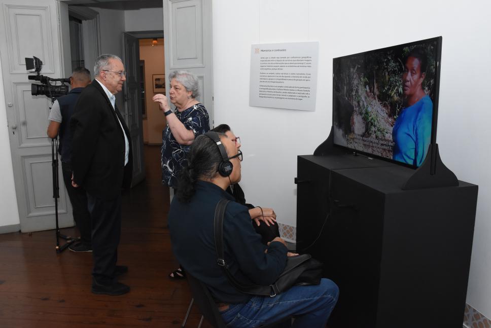 A profa. Margarida acompanha a visita do Reitor Pe. Josafá S.J. à exposição "Gávea - Território de Diversidades, Morada de Contradições". Ao lado, o funcionário Clóvis Gorgônio e Wanderlucy Bezerra assistem os vídeos do projeto Memória Rocinha.