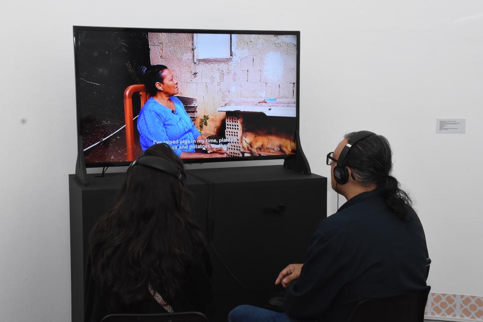 O funcionário Clóvis Gorgônio e Wanderlucy Bezerra assistem os vídeos do projeto Memória Rocinha, em exibição na sala "Memórias e contrastes", na exposição "Gávea - Território de Diversidades, Morada de Contradições".