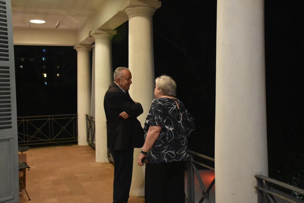 A profa. Margarida conversa com o Reitor Pe. Josafá S.J. na varanda do Solar.