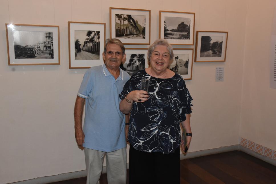 Retrato em grupo do fotógrafo Antônio Albuquerque e da profa. Margarida na exposição "Gávea - Território de Diversidades, Morada de Contradições".