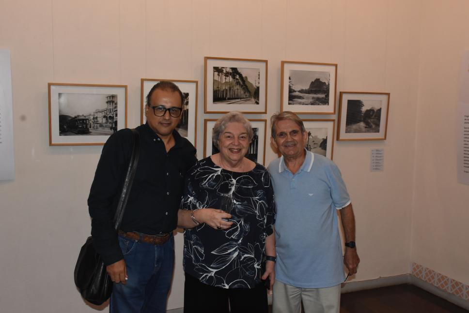 Retrato em grupo do funcionário Clóvis Gorgônio, da profa. Margarida e do fotógrafo Antônio Albuquerque na exposição "Gávea - Território de Diversidades, Morada de Contradições".