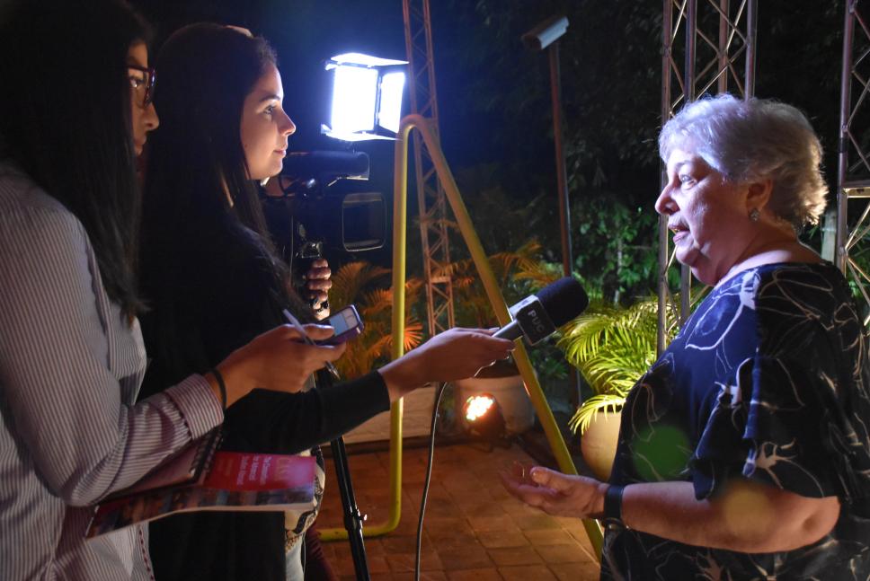 Professora Margarida durante entrevista para a TV PUC sobre a exposição "Gávea - Território de Diversidades, Morada de Contradições".