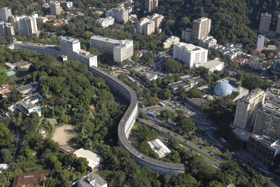 Foto área do bairro da Gávea com destaque para a PUC-Rio, o Conjunto Habitacional Marquês de São Vicente (Minhocão), parte da autoestrada Lagoa-Barra e o Planetário da Gávea.