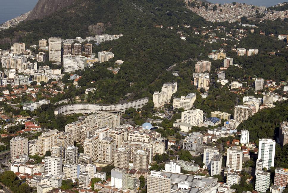 Foto área do bairro da Gávea com destaque à esquerda para o Conjunto Habitacional Marquês de São Vicente (Minhocão), a PUC-Rio ao centro e, ao fundo à direita, a Rocinha.