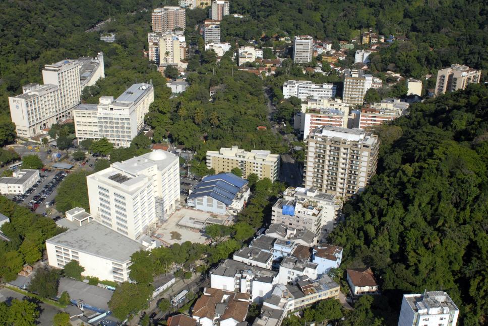 Foto área do bairro da Gávea com destaque para PUC-Rio à esquerda e a Rua Marquês de São Vicente à direita.
