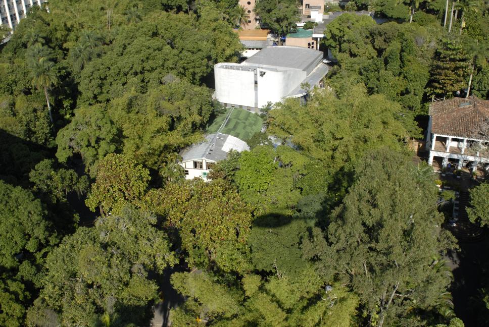 Foto aérea do campus Gávea da PUC-Rio com destaque para a sede da Cátedra UNESCO de Leitura e a Igreja do Sagrado Coração de Jesus e, ao lado esquerdo, o Solar Grandjean de Montigny.