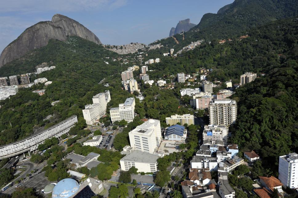 Foto aérea do bairro da Gávea. Destaque à esquerda para o Planetário e o Conjunto Habitacional Marquês de São Vicente (Minhocão), ao centro o campus Gávea da PUC-Rio e, ao fundo, a Rocinha.