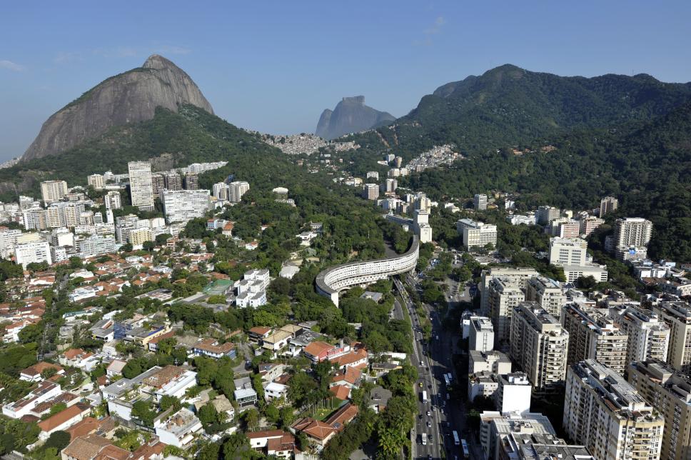 Foto aérea do bairro da Gávea. Em destaque ao centro, a autoestrada Lagoa-Barra, o Conjunto Habitacional Marquês de São Vicente e o campus da PUC-Rio. Ao fundo, o Morro Dois Irmãos, a Rocinha e a Pedra da Gávea.