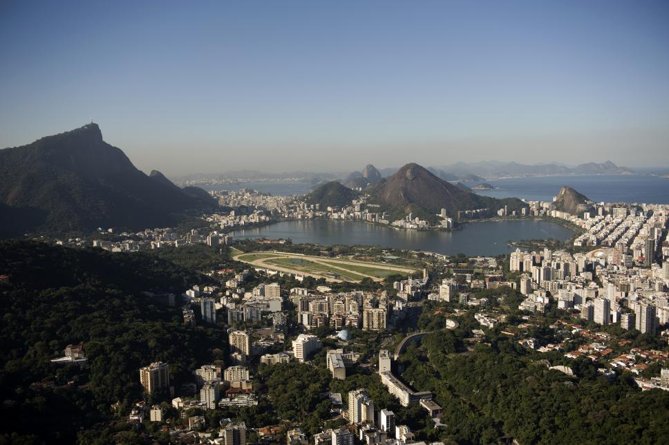 Vista aérea do Jockey Club Brasileiro e da Lagoa Rodrigo de Freitas. À esquerda o Morro do Corcovado e, na parte inferior à direita, o campus Gávea da PUC-Rio.