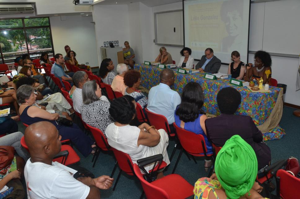 Na mesa da esq. para dir.: Schuma Schumaher (Redeh), profa. Maria Sarah da Silva Telles (SOC), prof. Luiz Roberto Azevedo Cunha (ECO, Decano CCS), profa. Regiane Augusto de Mattos (HIS, NIREMA), Kelly Quirino (Fundação Banco do Brasil)