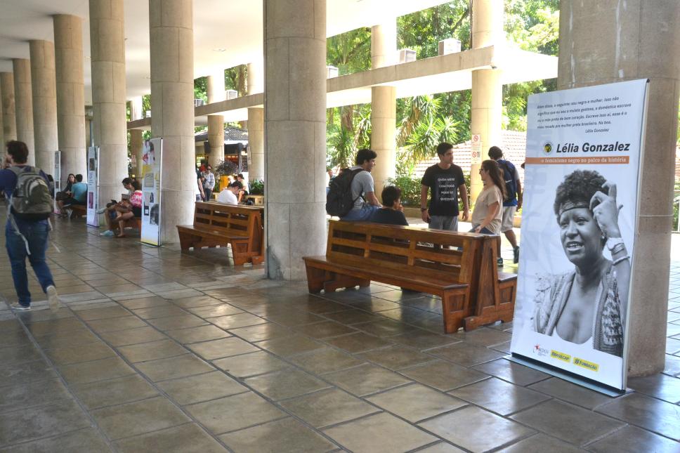 Exposição "Lélia Gonzales - O feminismo negro no palco da história" realizada nos pilotis do Edifício da Amizade.