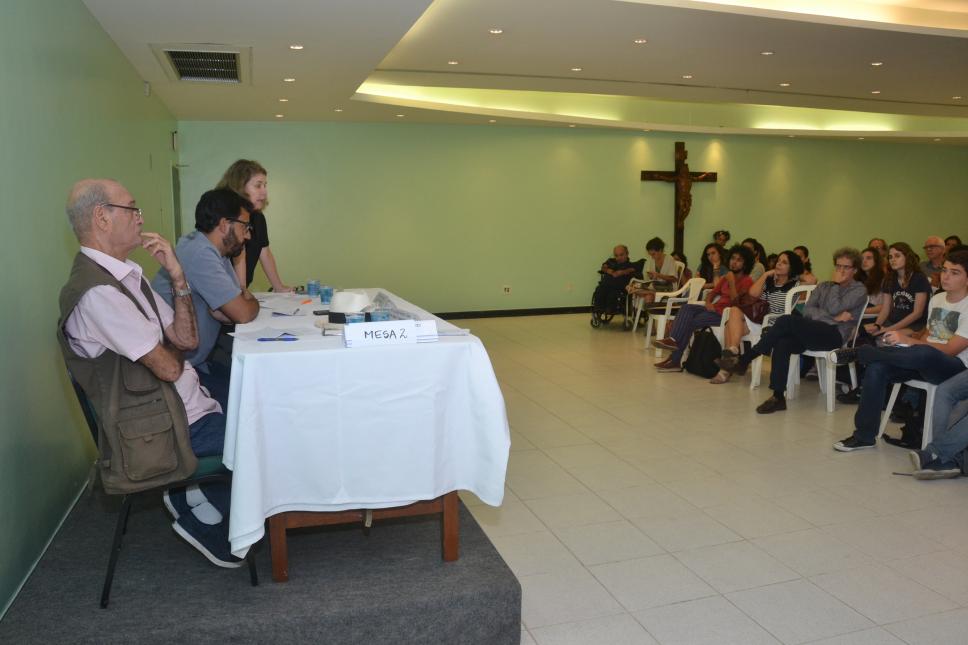 Na mesa da esq. para dir.: prof. Luiz Jorge Werneck Vianna (CIS), prof. Fernando Perlatto (Departamento de História/UFJF), profa. Monica Herz (IRI); na 1ª fila - da esq. para dir.: 4ª - profa. Maria Sarah da Silva Telles (SOC); 5º - prof. Marcelo Tadeu Baumann Burgos (SOC)