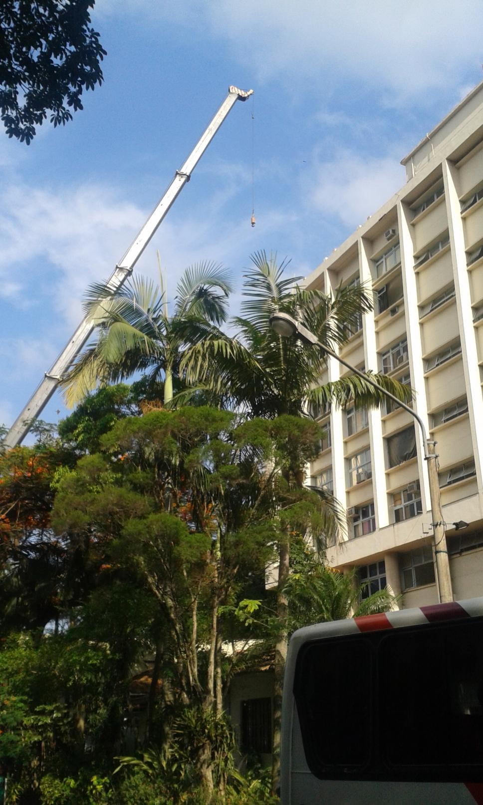 Guindaste posicionado para içar e fazer a entrega dos novos equipamentos pelas janelas dos laboratórios do Departamento de Química.