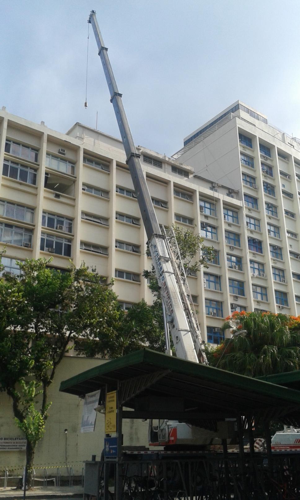 Guindaste posicionado para içar os novos equipamentos dos laboratórios do Departamento de Química.