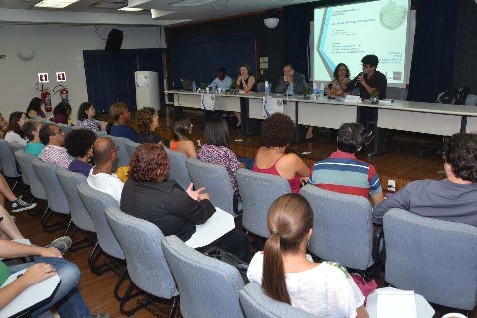 Na mesa da esq. para dir.: prof. Valério da Silva (Fundação Bento Rubião), profa. Gisele Porto Sanglard (Casa de Oswaldo Cruz/Fiocruz), prof. Luiz Roberto Azevedo Cunha (ECO, Decano CCS), profa. Andreia Clapp Salvador (SER) e o prof. Rafael Soares Gonçalves (SER)