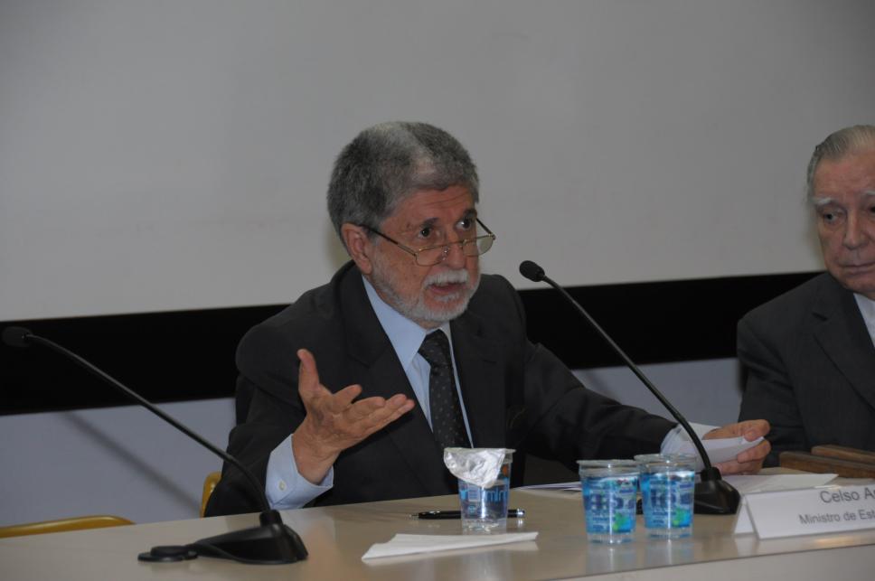 Na mesa da esq. para dir.: Ministro da Defesa Celso Amorim, prof. pe. Francisco Ivern Simó S.J. (Vice-Reitor)