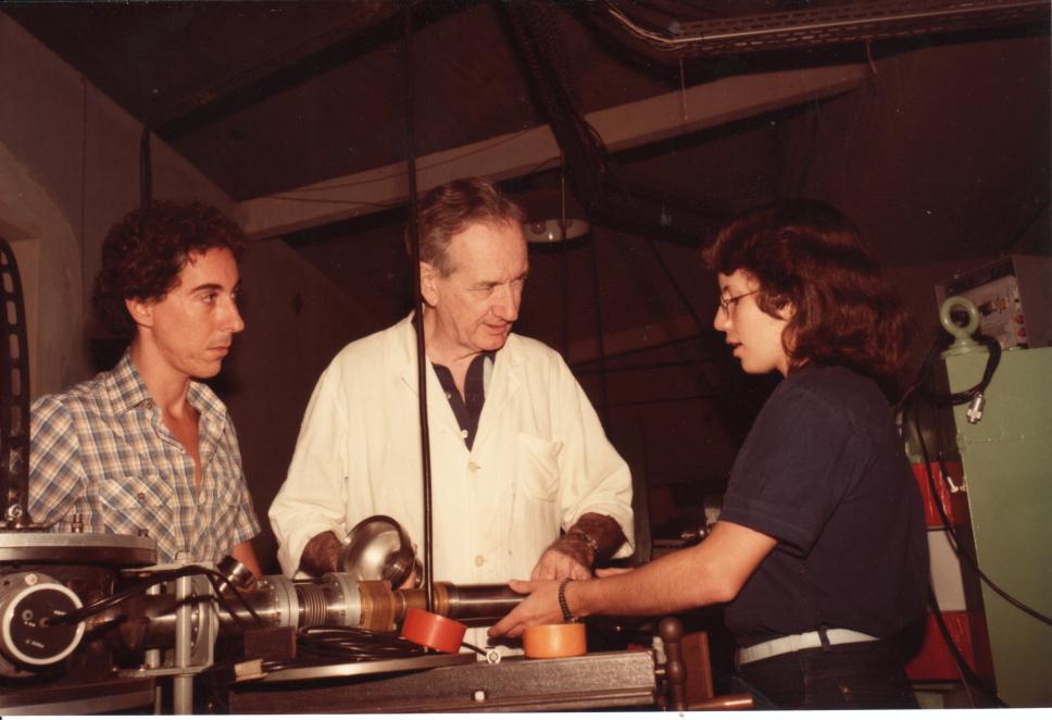 O prof. pe. Thomas Cullen S.J. e o funcionário Sérgio Martins Xavier no Laboratório de Física do Estado Sólido localizado no subsolo do Edifício Padre Francisco Xavier Röser, na Ala Leme.