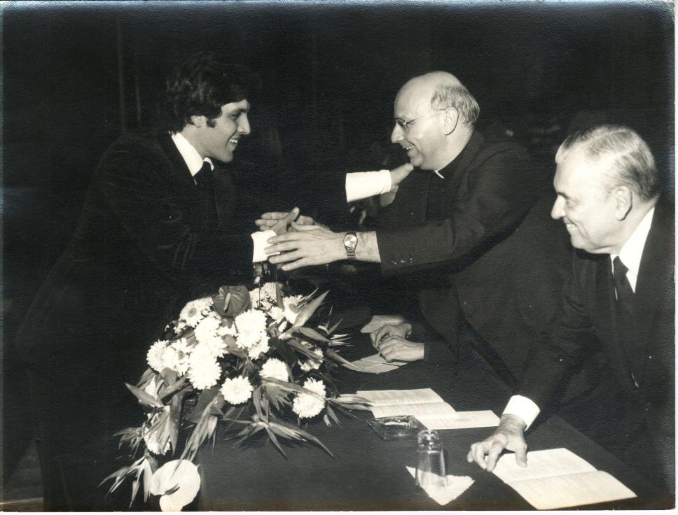 O prof. pe. Amarilho Checon S.J. cumprimenta formando na cerimônia de formatura dos cursos de engenharia do CTC.