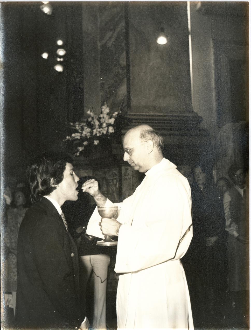 O pe. Amarilho Checon S.J. oferece hóstia consagrada para aluno na missa de formatura dos formandos do curso de Engenharia Civil da PUC-Rio.