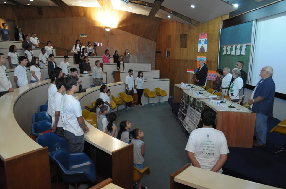 Mesa com palestrantes e plateia presente no evento comemorativo dos 31 anos de fundação do NEAM.