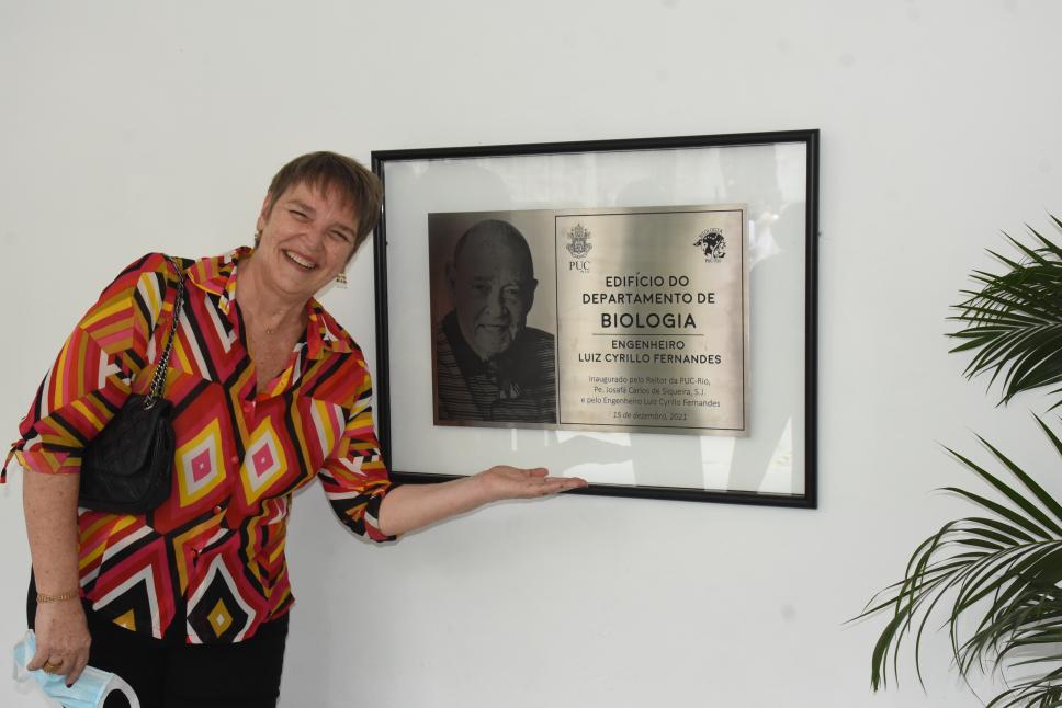 A diretora do Departamento de Biologia, profa. Rejan Guedes-Bruni, ao lado da placa do novo prédio.
