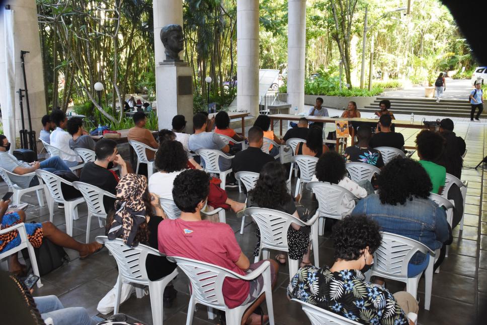 Na mesa da esq. para dir.: aluno Lucas Adeniran (COM), profa. Aza Njeri (Viviane Moraes) (LET) e Wesley Teixeira (ONG Coalizão Negra Por Direitos).
