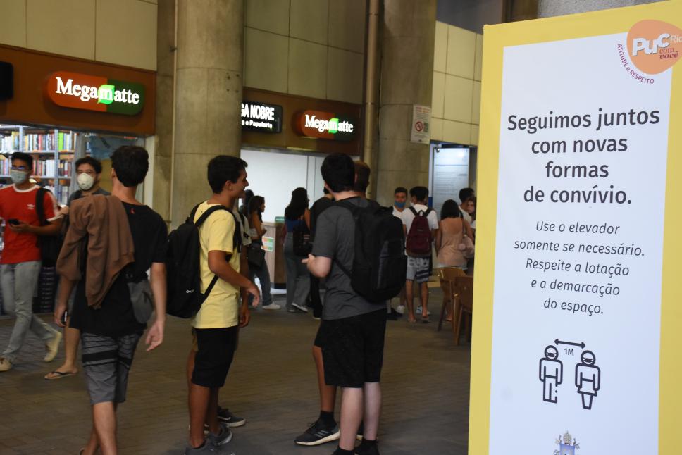 Totem com sinalização sobre a necessidade de distanciamento para uso dos elevadores.