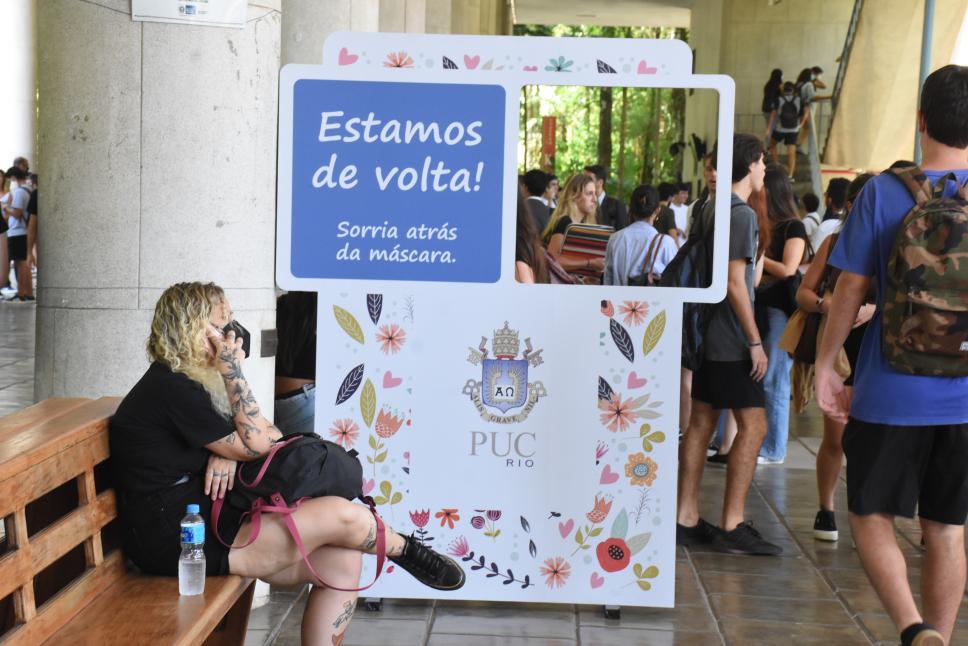 Totem para fotografia 'Estamos de volta! Sorria atrás da máscara'.
