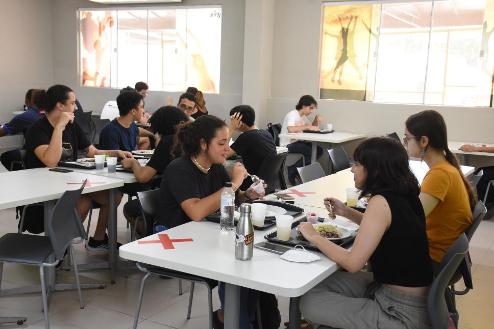 Mesas do bandejão da PUC-Rio com sinalização de distanciamento.