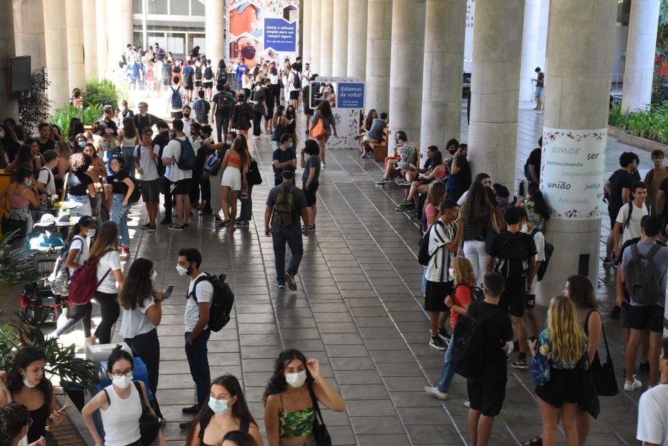 Pilotis ocupados com o retorno às atividades presenciais no campus Gávea.
