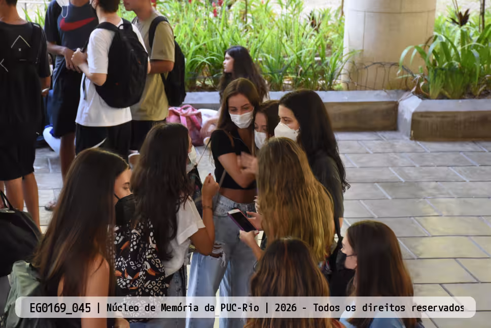 Alunas se reencontram na volta às aulas presenciais na PUC-Rio.