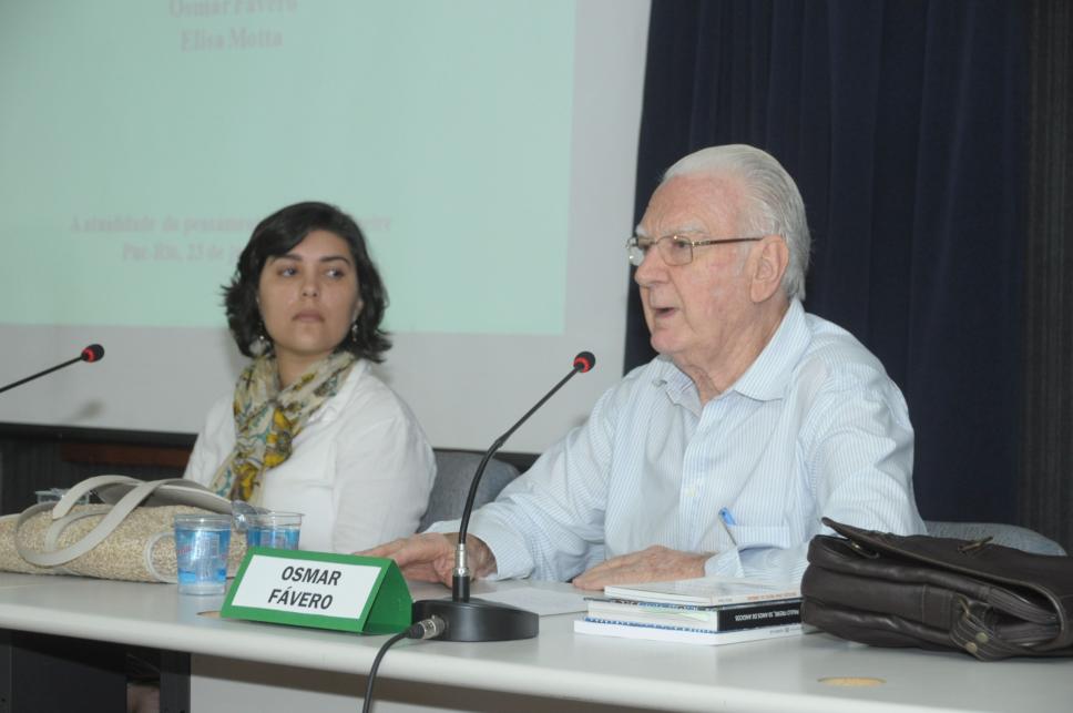 Os professores Elisa Siqueira e Osmar Fávero participam da mesa sobre as fichas de cultura do sistema de alfabetização Paulo Freire.