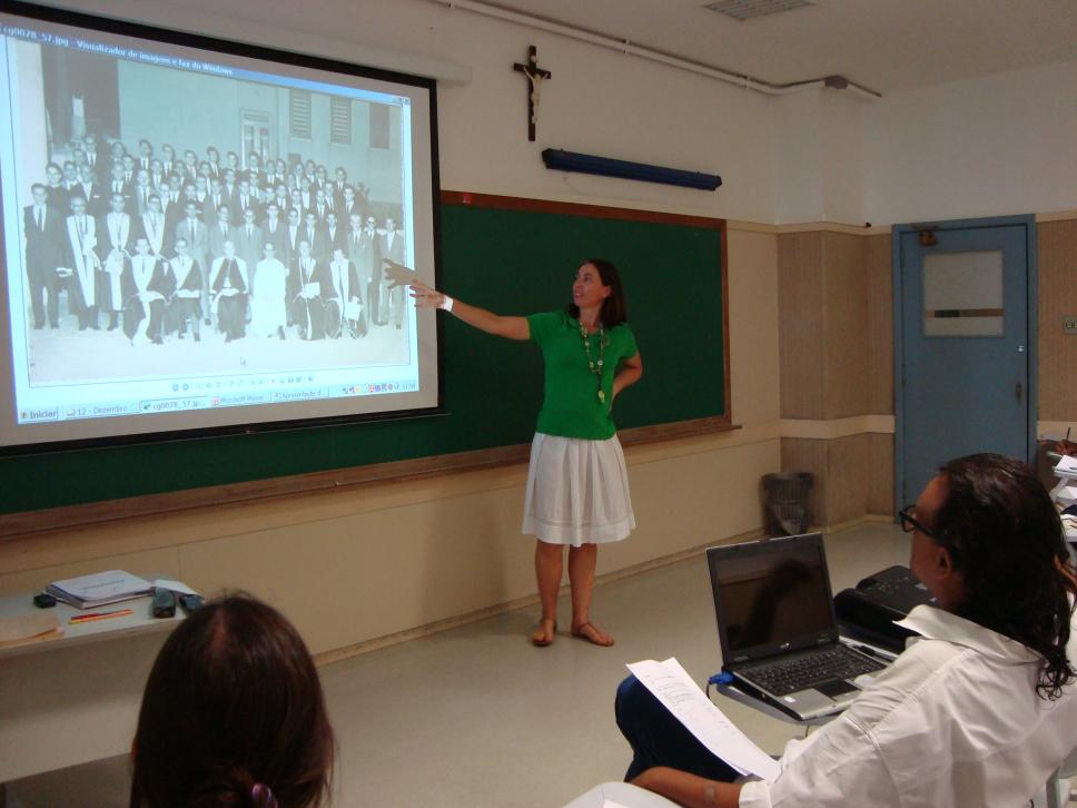 A pesquisadora Silvia Ilg apresenta uma fotografia do acervo do Núcleo de Memória da PUC-Rio.