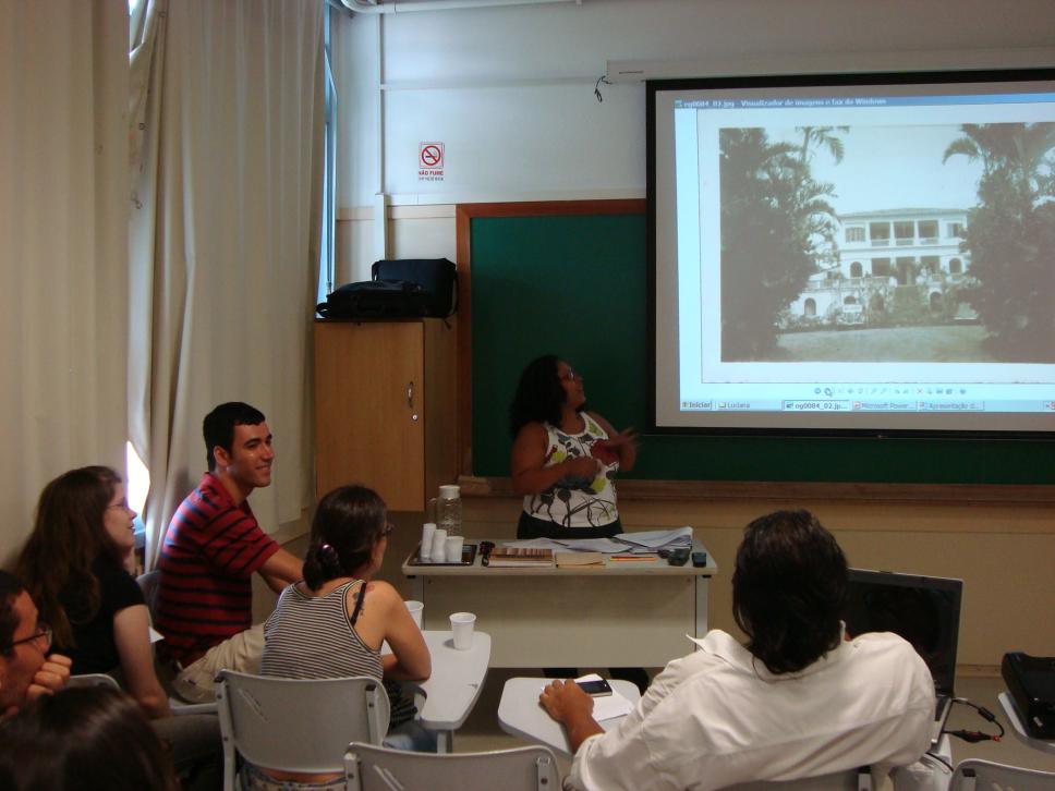 A bolsista de Iniciação Científica, a aluna Luciana Santos, apresenta as fotografias do acervo do Núcleo de Memória.