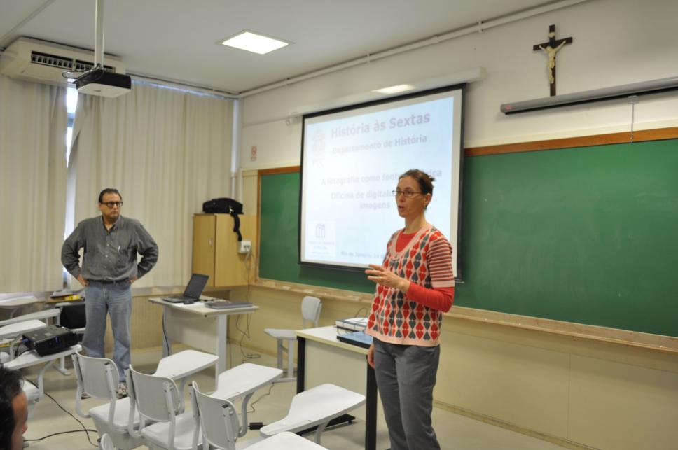 Os pesquisadores Clóvis Gorgônio e Silvia Ilg apresentam a oficina do Núcleo de Memória da PUC-Rio.