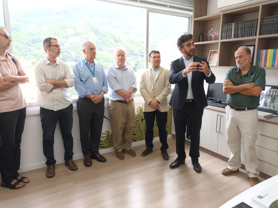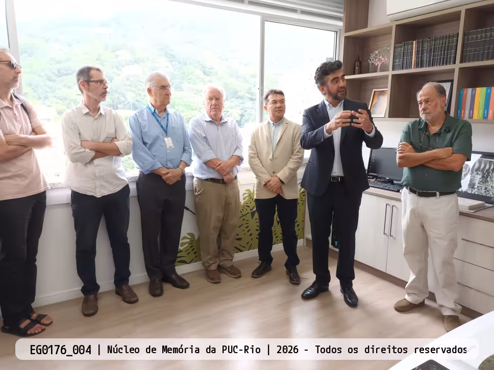Da esq. para dir.: prof. Henrique Estrada Rodrigues (HIS), n.i., Giuseppe Lo-Bianco (FPLF), prof. Raul Rosas e Silva (CIV), pe. Roberto Barros Dias S.J. (FPLF), prof. pe. Anderson Antonio Pedroso S.J. (DAD, Reitor), prof. Marco Antonio Villela Pamplona (HIS, Núcleo de Memória)