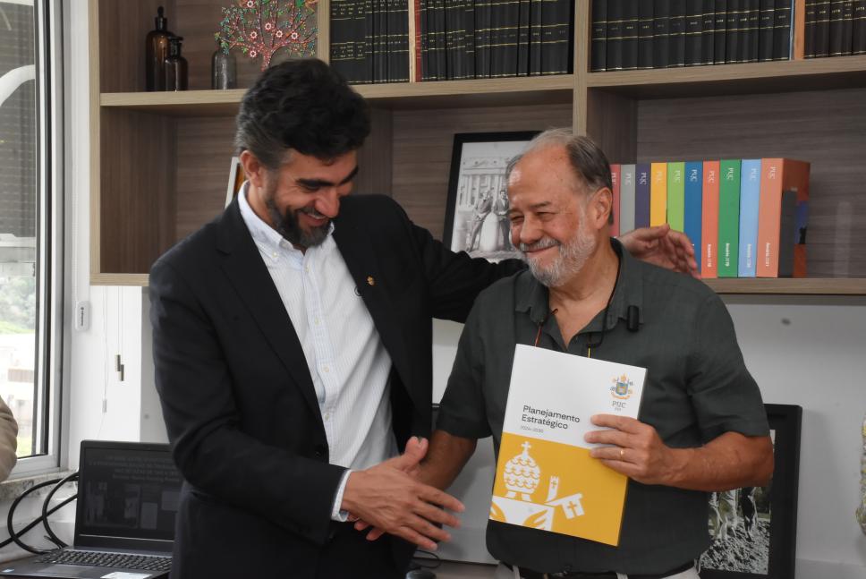 O prof. Marco Antonio recebe o Planejamento Estratégico da PUC-Rio de 2024-2030 do reitor pe. Anderson S.J.