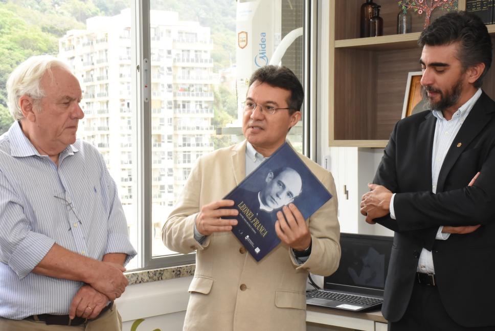 Pe. Roberto S.J. apresenta o livro Leonel Franca: entre anchietas e vieiras, edição comemorativa do 40º aniversário da Fundação Padre Leonel Franca.