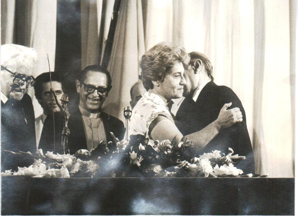 A professora e ex-candidata ao governo do Estado do Rio de Janeiro, Sandra Cavalcanti, cumprimenta Tancredo Neves após a entrega da estatueta Dom Quixote.