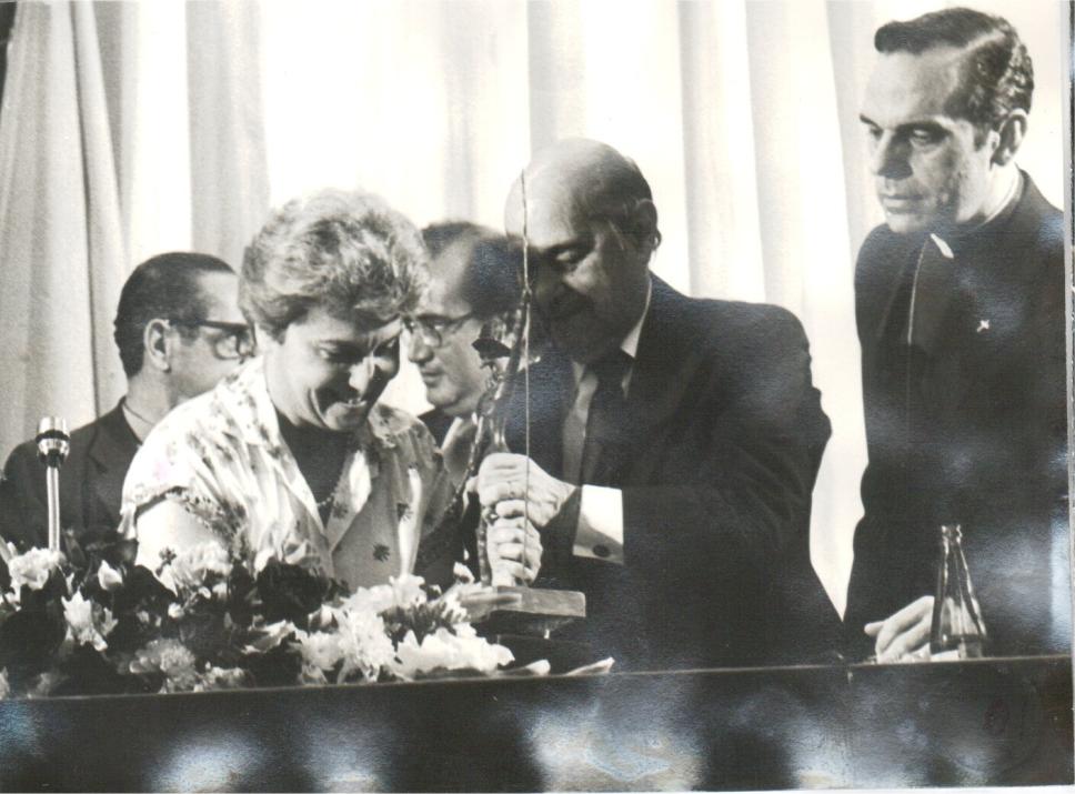 A professora e ex-candidata ao governo do Estado do Rio de Janeiro, Sandra Cavalcanti, entrega a estatueta Dom Quixote a Tancredo Neves.