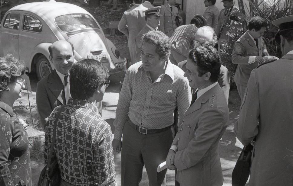O reitor pe. Mac Dowell S.J. e convidados conversam com o maestro da Banda Sinfônica do Corpo de Bombeiros.