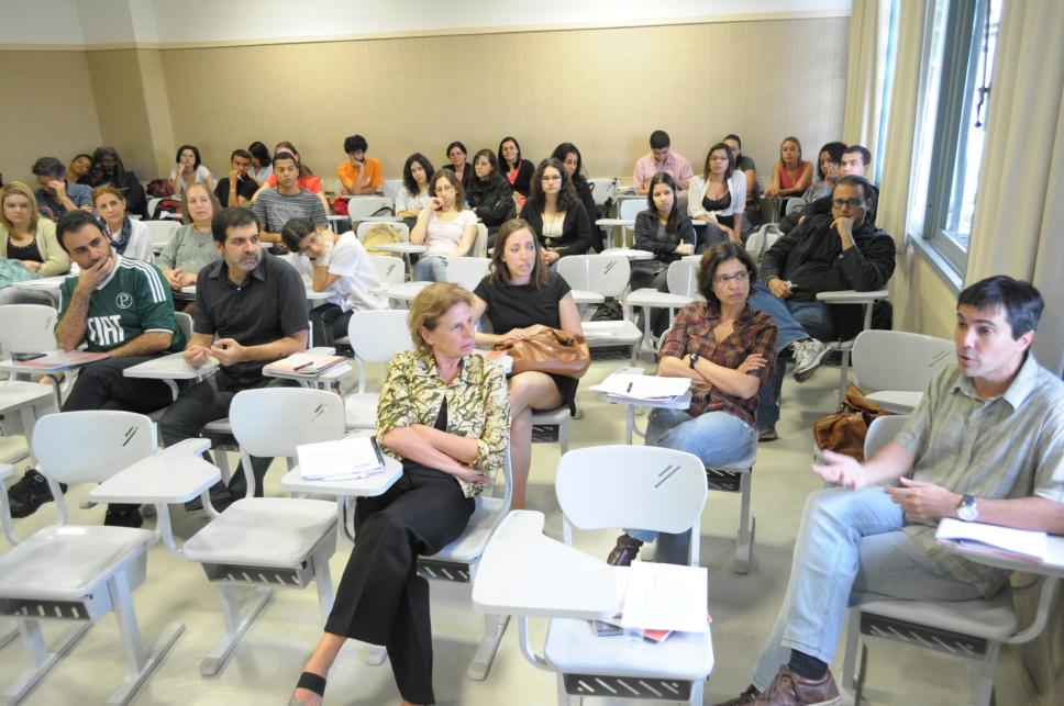 O prof. Leonardo Affonso de Miranda avalia o trabalho de monografia da aluna Luciana Santos.