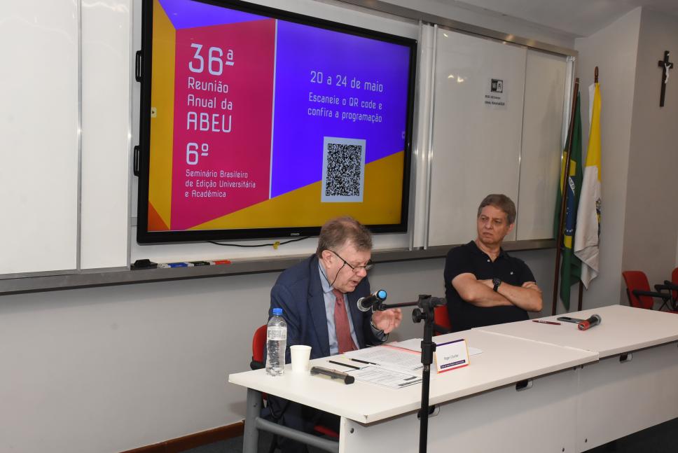 Conferência do historiador francês Roger Chartier. Ao seu lado está o prof. Jézio Gutierre (Presidente da ABEU e diretor da Editora Unesp).