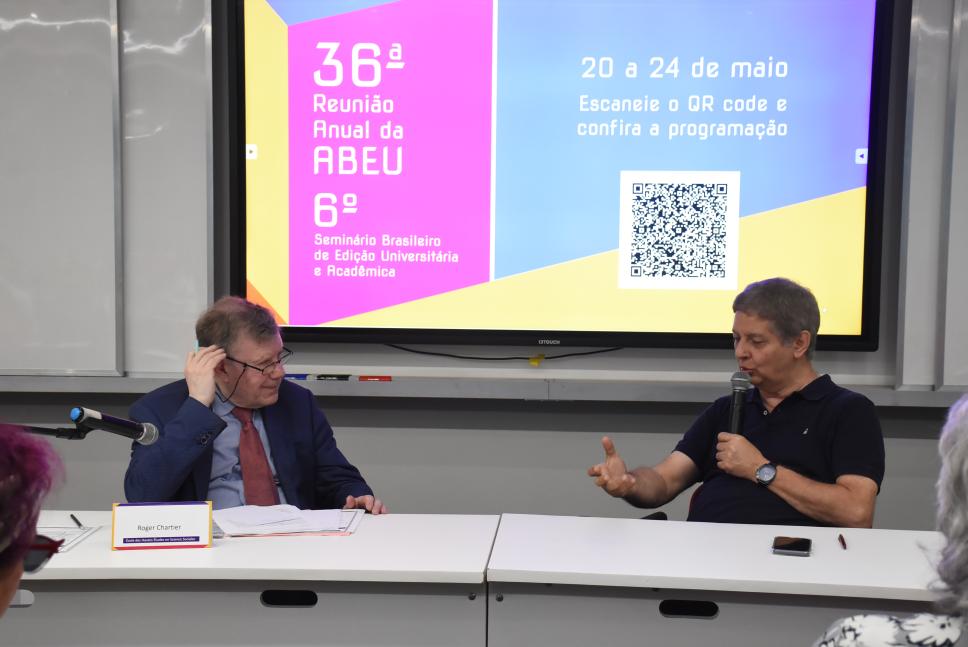 O prof. Jézio Gutierre (Presidente da ABEU e diretor da Editora Unesp) faz a abertura da conferência com o historiador francês Roger Chartier.