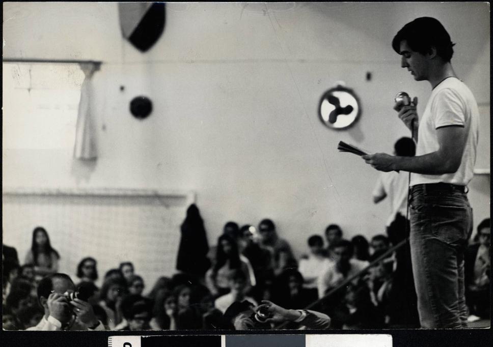 Manifestação estudantil no antigo ginásio da PUC-Rio. Discussões sobre a participação dos alunos da PUC-Rio no XXX Congresso da UNE.