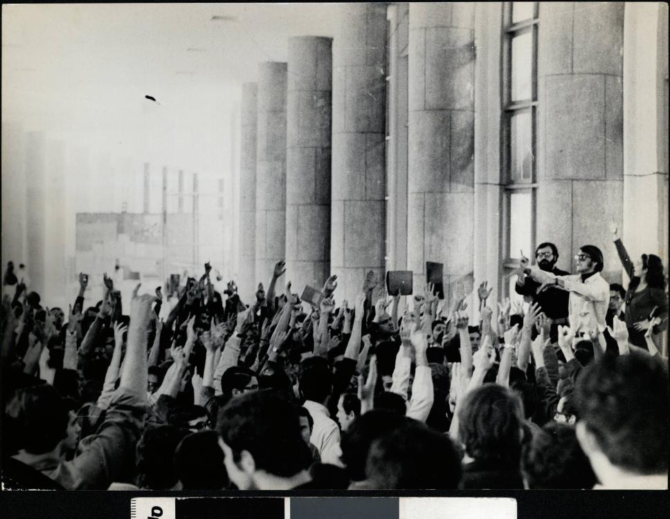 Assembleia de estudantes nos pilotis para discutir uma greve em protesto a possível expulsão de 70 alunos, acusados de terem invadido uma reunião do Conselho Universitário na qual se discutia a participação dos alunos numa comissão para estudo da Reforma Universitária. Matéria publicada no Correio da Manhã de 03/10/1968, p. 9. A foto não foi publicada.