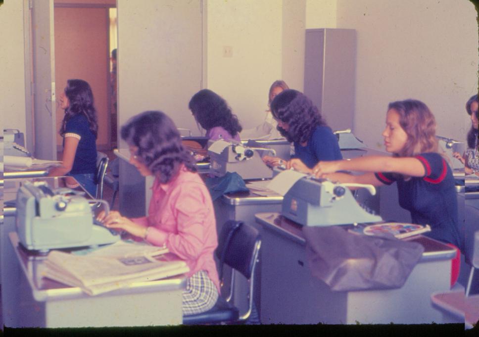 Alunas em aula de datilografia em máquinas de escrever mecânicas.